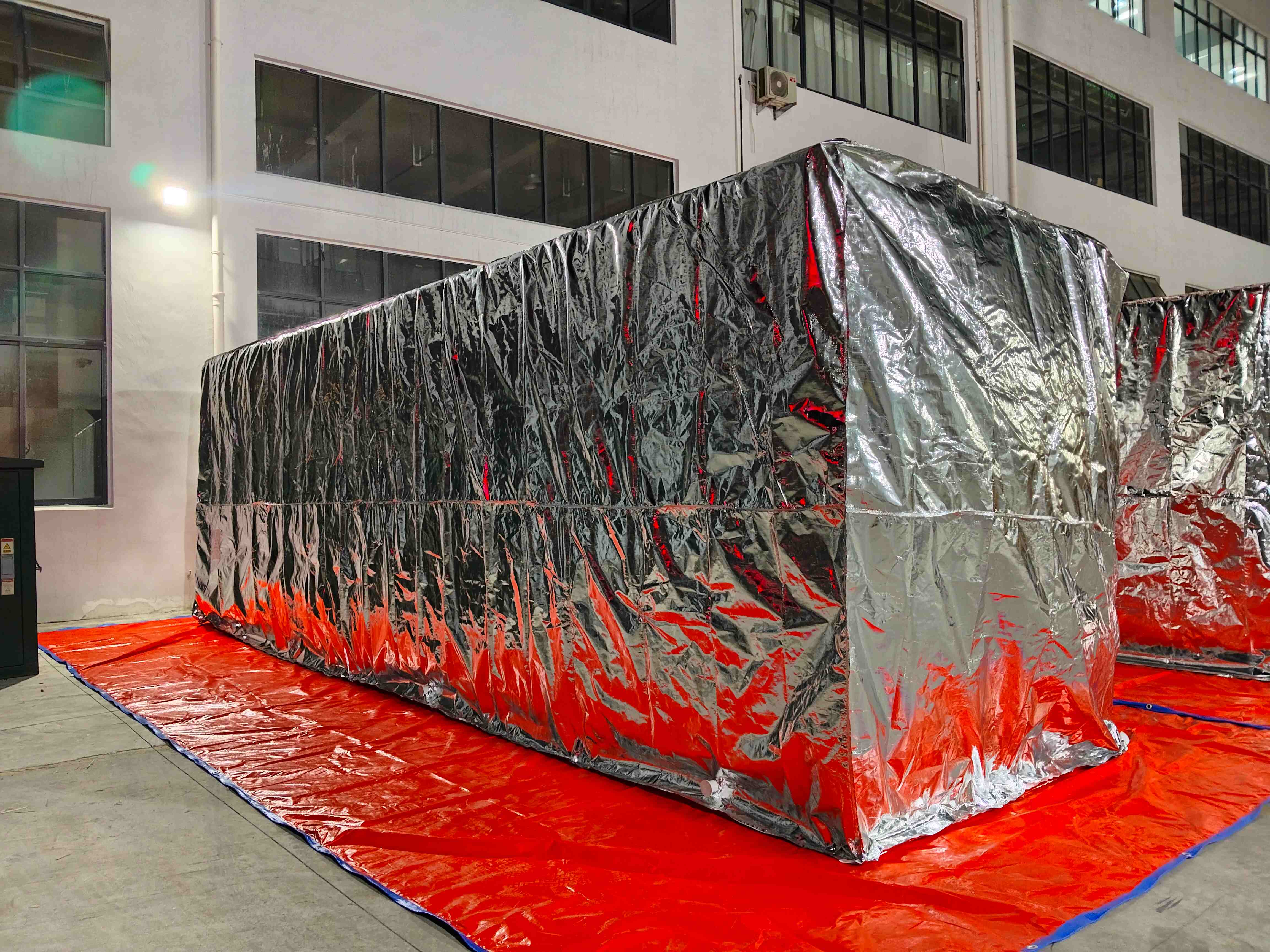 A primeira camada é embrulhada em filme, a segunda camada é tratada a vácuo com papel alumínio e a terceira camada é um pano à prova de chuva.