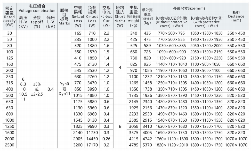 Parâmetros técnicos do transformador de distribuição do tipo seco fundido em resina epóxi SCB11-30 ~ 2500/10